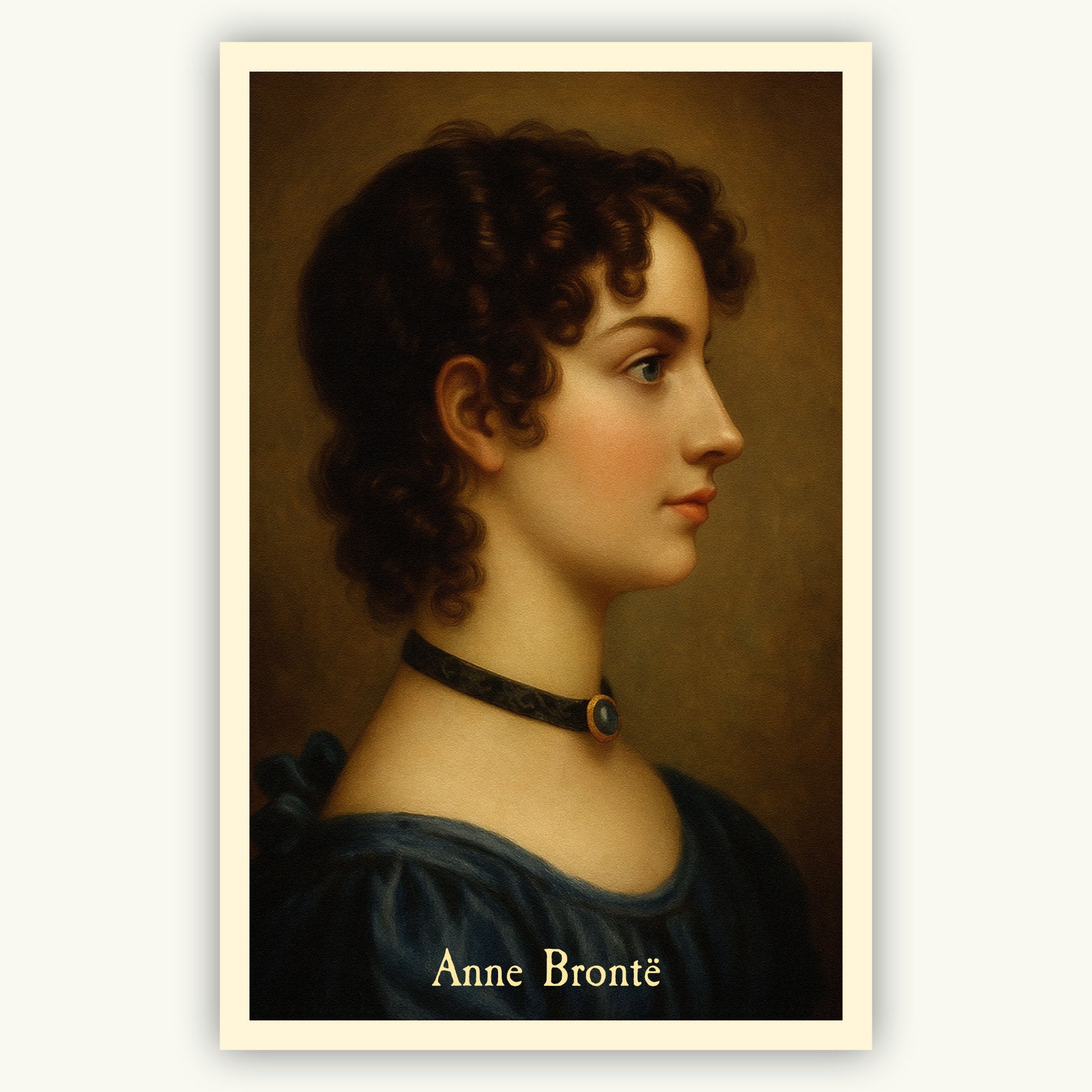 Celebrate the quiet strength of Anne Brontë, author of Agnes Grey and The Tenant of Wildfell Hall, with this exclusive Quill & Folly portrait. Depicted in rich, Regency-era tones, Anne is shown in poised profile: dusky curls, sapphire eyes, and a cameo-style velvet choker that hints at her independent spirit. A simple “Anne Brontë” sits below in period lettering, letting the novelist’s resolute gaze speak for itself.