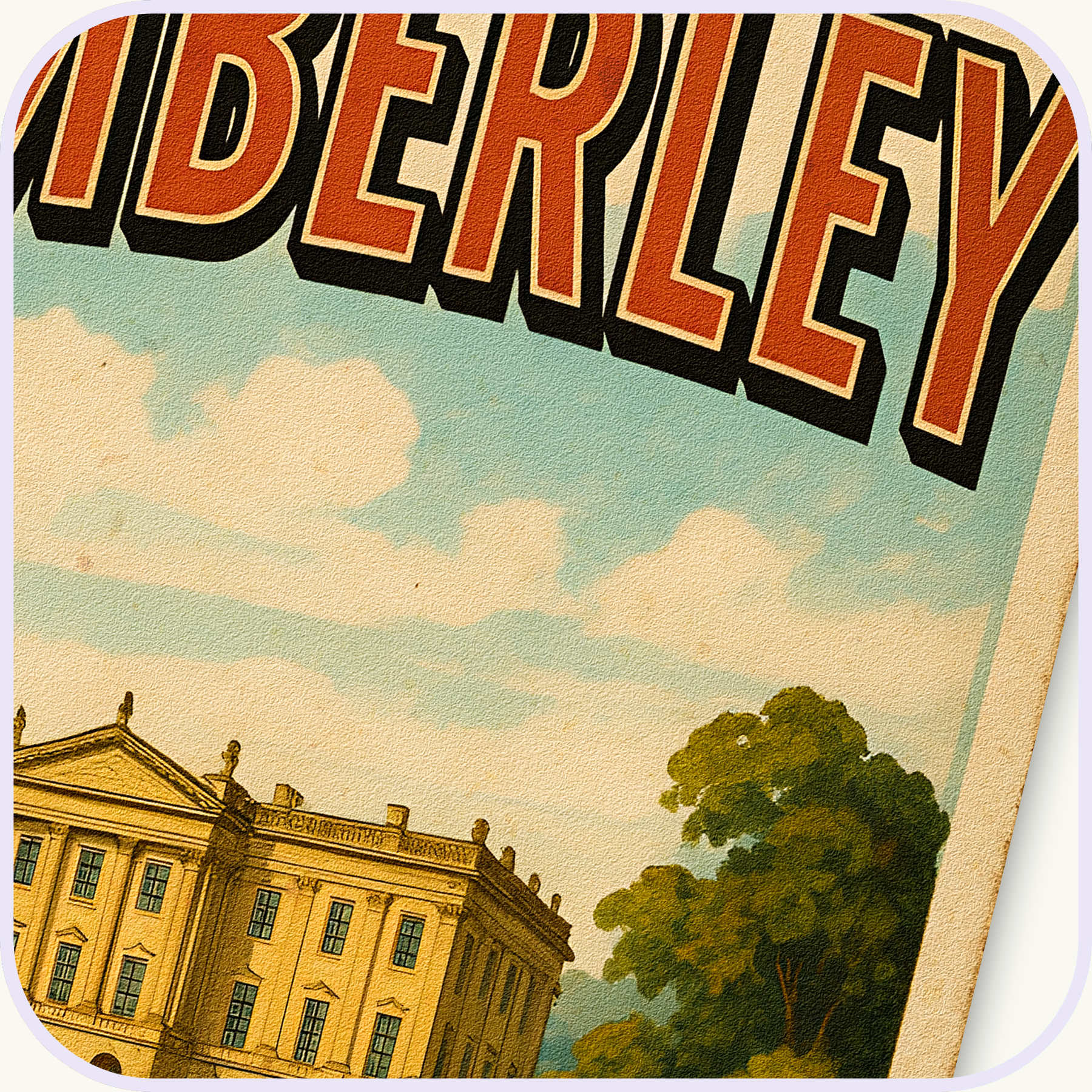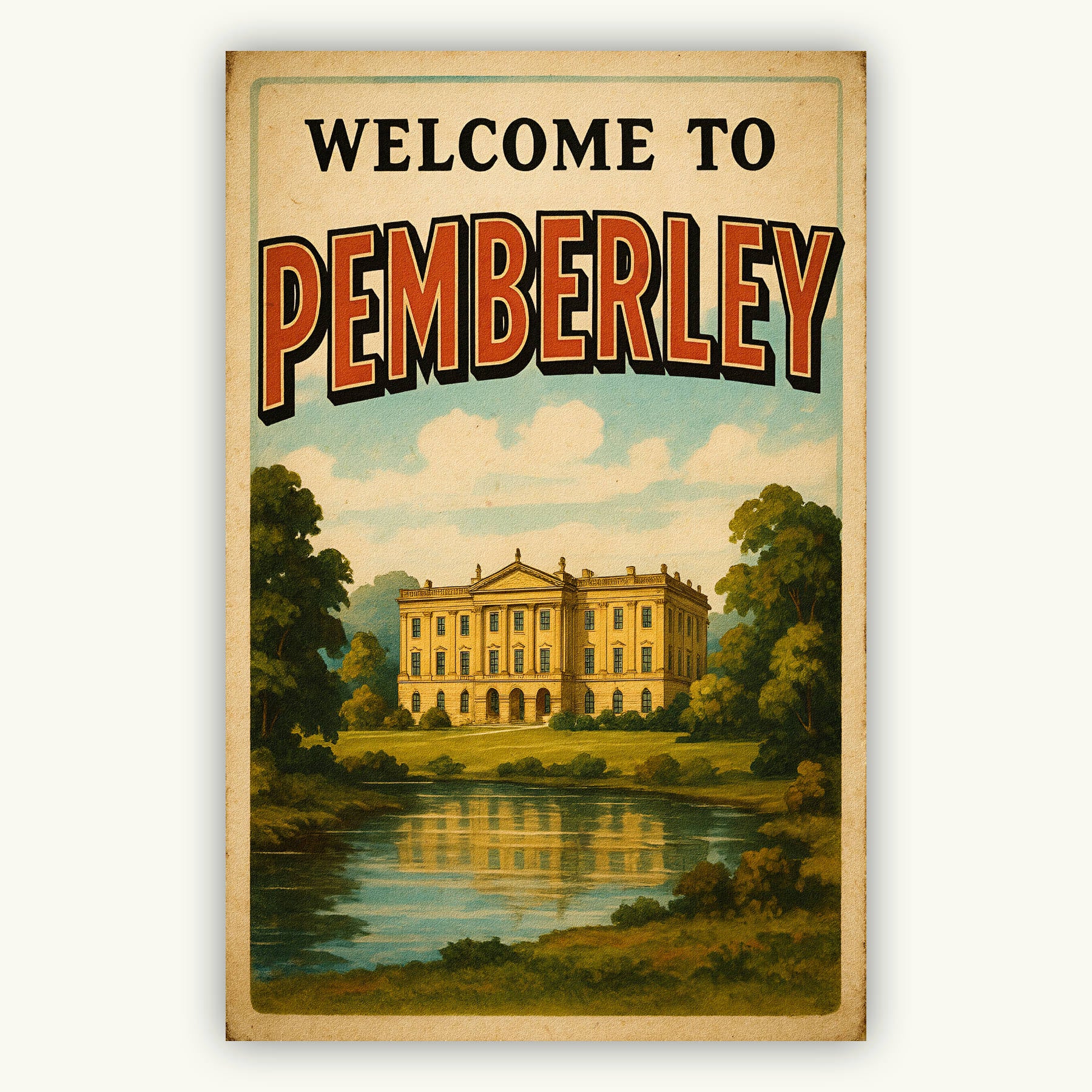 Take a Regency road-trip without leaving your reading nook. This exclusive “Welcome to Pemberley” art print re-imagines Mr Darcy’s grand estate as a 1930s railway-tour poster—bold block lettering, sun-washed pastel skies, and the stately house mirrored on its famous lake. Printed on 175 gsm, acid-free matte paper with archival pigment inks, each giclée delivers velvety colour and crisp period texture that won’t fade before the next Netherfield Ball.