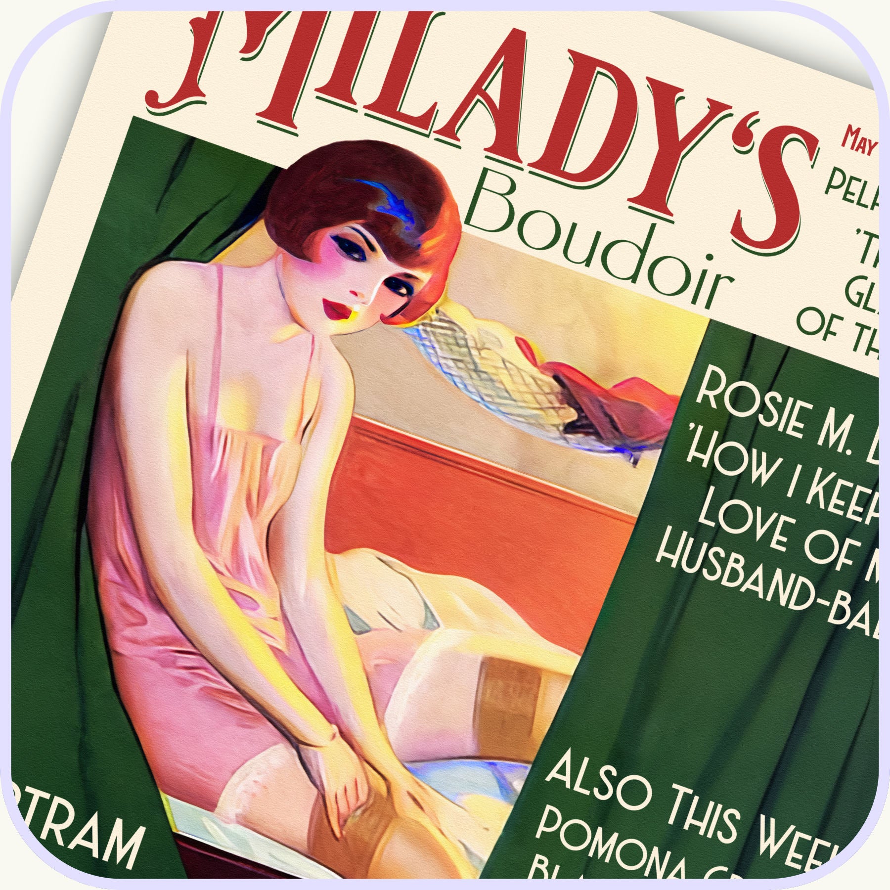 Give your walls a splash of Jazz-Age mischief with this tongue-in-cheek cover for Milady’s Boudoir - Aunt Dahlia's women’s magazine often name-checked by Bertie Wooster. Our original artwork imagines the 25 May 1925 issue, complete with racy feature titles: Rosie M. Banks on “How I Keep the Love of My Husband-Baby” and Bertie’s own sartorial column, “What the Well-Dressed Man Is Wearing.” A sultry flapper lounges centre-stage, rendered in lush Art-Deco color that Jeeves would certainly deem “most vivid, sir.”